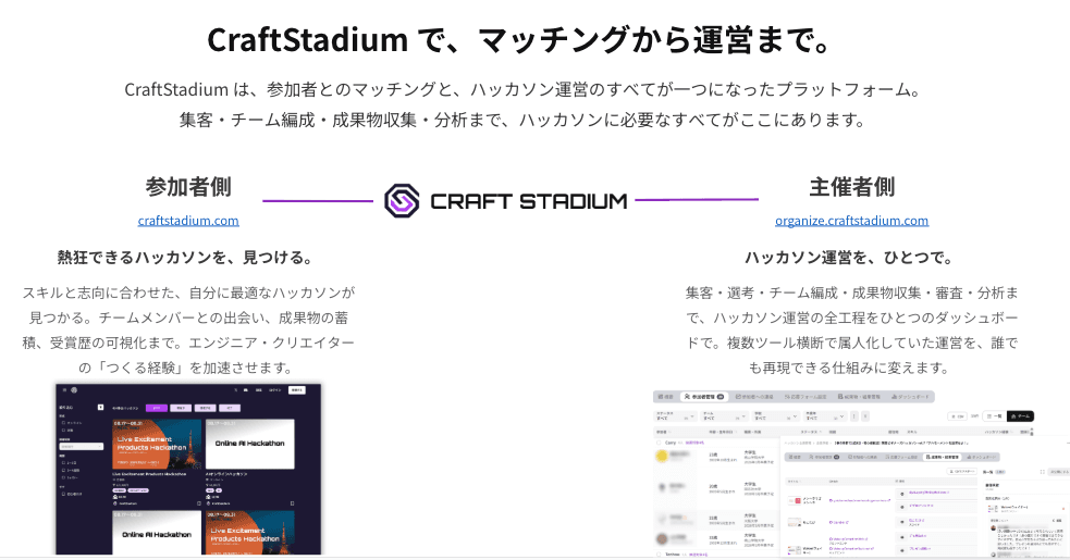 ハッカソン開催を検討する企業向けに、connpass等の汎用ツールでは対応しきれない課題と、専用プラットフォームCraftStadiumが提供する価値を解説します。